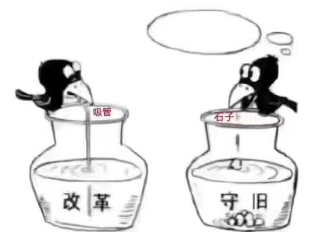 乌鸦喝水的方式已经变了:一个还在扔石头,另一个已经用上吸管了。